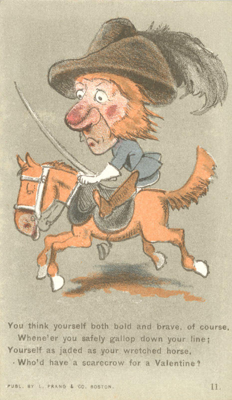 Text: You think yourself both bold and brave, of course, / Whene'er you safely gallop down your line; / Yourself as jaded as your wretched horse, / Who'd have a scarecrow for a Valentine?