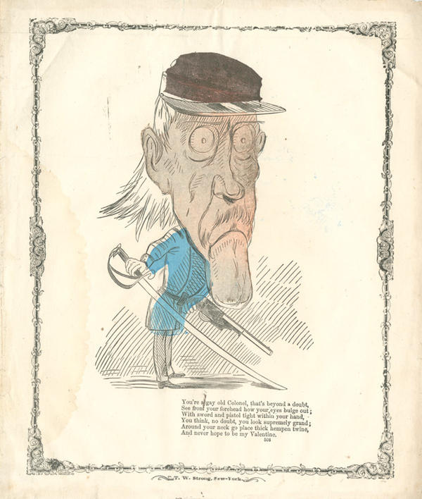 Text: You're a gay old Colonel, that's beyond a doubt, / See front your forehead how your eyes bulge out; / With sword and pistol tight within your hand, / You think, no doubt, you look supremely grand; / Around your neck go place thick hempen twine, / And never hope to be my Valentine.