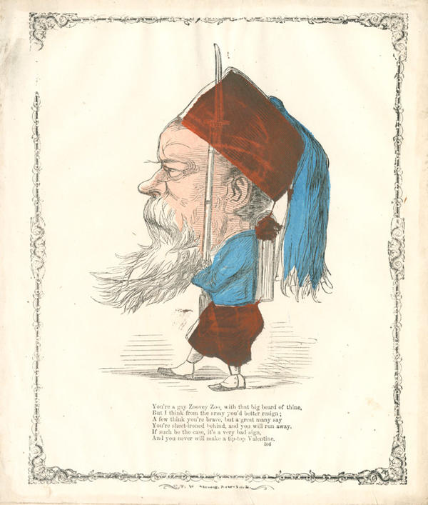 Text: You're a gay Zoovey Zoo, with that big beard of thine, / But I think from the army you'd better resign; / A few think you're brave, but a great many say / You're sheet-ironed behind, and you will run away. / If such be the case, it's a very bad sign, / And you never will make a tip-top Valentine.