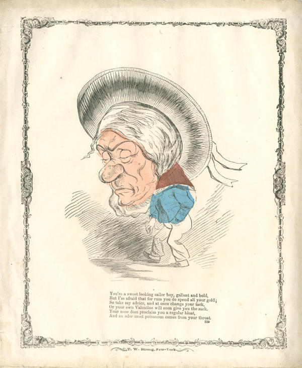 Text: You're a sweet looking sailor boy, gallant and bold, / But I'm afraid that for rum you do spend all your gold; / So take my advice, and at once change your tack, / Or your own Valentine will soon give you the sack. / Your nose does proclaim you a regular bloat, / And an odor most poisonous comes from your throat.