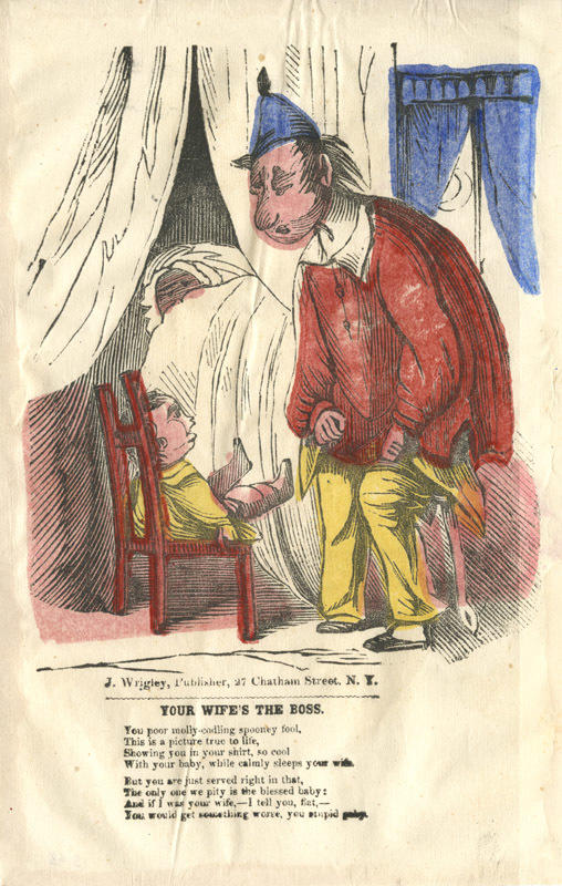 You poor molly-coddling spooney fool, / This is a picture true to life, / Showing you in your shirt, so cool / With your baby,
