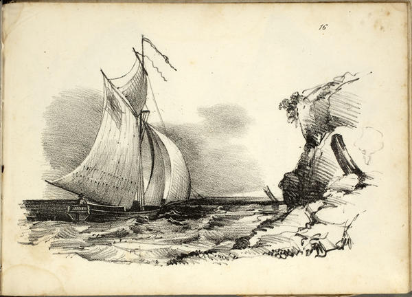 Plate from drawing book containing title page and 23 numbered leaves of lithographed plates, interleaved with [21] blank leaves for copying. Includes landscape, rustic architectural, and maritime views. Also contains anatomical designs.