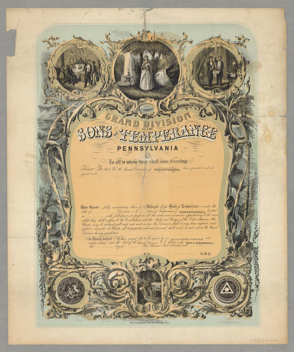 Membership certificate containing a border comprised of vignettes, filigree, and other pictorial details. Vignettes depict "Love for your members in sickness & in health" showing a sick bed scene; "Purity of Heart & Life" showing an allegorical scene with a woman dressed in white standing in the forest near a lake and fountain; "Fidelity to your solemn obligations" portraying a scene of a member taking his oath in a parlor; and a scene of a man sitting in bed and reading. Other pictorial details include vinery, forestry, and rock formations. Also contains the seals of the "Grand Division State of Pennsylvania" and the "National Division, S of T Organized June 14, 1844." in the lower corners. Sons of Temperance, established in New York in 1842, was a fraternal and benevolent organization that espoused total abstinence.