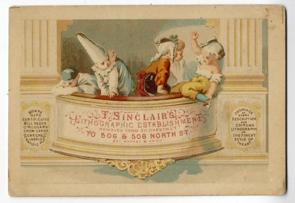 T. Sinclair's lithographic establishment removed from 311 Chestnut to 506 & 508 North St. bet. Market & Arch [graphic] : Bonds, maps, certificates, bill heads, circulars, show cards, checks, labels, scientific plates. Drawings of every description and chromo lithography in the finest style of the art.