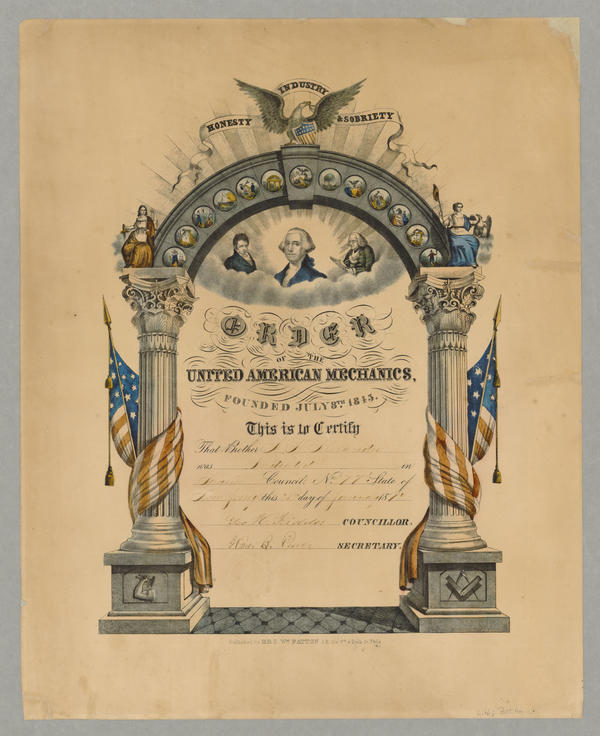 Membership certificate for the fraternal, nativist organization containing patriotic vignettes and pictorial details adorning and bordering an ornamented arch. Includes portraits of George Washington and Benjamin Franklin in addition to state seals, the figures of Liberty and Justice, American flags, and the American eagle and shield. OUAM, founded in Philadelphia in 1845 as the Union of Workers, was an anti-immigration, anti-Catholic benevolent society that provided its white, native-born members with sick and funeral funds.