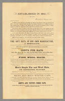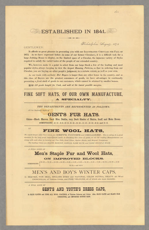 Circular advertisement for the hat manufacturer established in 1841. Contains captioned images of 66 types of men's and children's hats for the "Fall" season of 1875. Captions detail style, finish, and colors. In tribute to the upcoming Centennial Exhibition, vignette at top depicts the proposed design for Memorial Hall, i.e., the Arts Gallery at the Centennial. View includes pedestrian traffic. Internal text promotes the quality and styles of men's and boys' hats offered, including fine soft hats, fur and wool hats, winter caps, dress caps, and black silk conductor and imported Scotch caps. Text on verso advertises "Ladies & Gent's Buckskin & Kid Gloves"; "Ladies' and Misses' Furs" and the "Millinery Department. Ladies & Misses Trimmed Hats" in addition to the request that orders contain the correct number of the style listed on the circular.