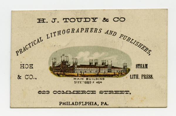 Series of trade cards containing depictions of Centennial buildings to advertise the Philadelphia lithographic establishment's Centennial views and the prominent printing press company. Buildings depicted include the Main Building, Agricultural Hall, Horticultural Hall, and Machinery Hall. Also contains promotional text on verso reading "All visitors should procure one as a memento of the Great International Exhibition" at Toudy & Co. or "Care R. Hoe & Co., Machinery Hall, Centennial Grounds."