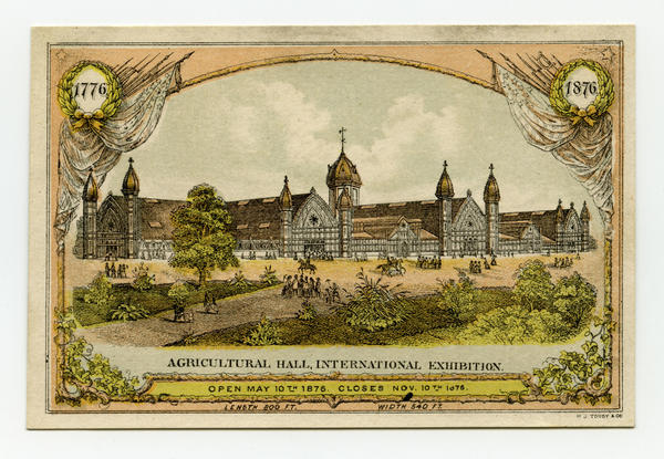 Series of trade cards containing depictions of Centennial buildings to advertise the Philadelphia lithographic establishment's Centennial views and the prominent printing press company. Buildings depicted include the Main Building, Agricultural Hall, Horticultural Hall, and Machinery Hall. Also contains promotional text on verso reading "All visitors should procure one as a memento of the Great International Exhibition" at Toudy & Co. or "Care R. Hoe & Co., Machinery Hall, Centennial Grounds."