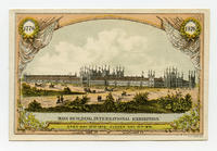 Series of trade cards containing depictions of Centennial buildings to advertise the Philadelphia lithographic establishment's Centennial views and the prominent printing press company. Buildings depicted include the Main Building, Agricultural Hall, Horticultural Hall, and Machinery Hall. Also contains promotional text on verso reading "All visitors should procure one as a memento of the Great International Exhibition" at Toudy & Co. or "Care R. Hoe & Co., Machinery Hall, Centennial Grounds."