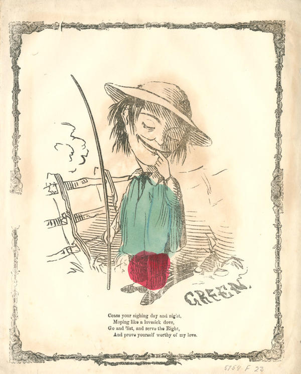 A man wears rustic attire and a wide-brimmed hat. He holds a long walking stick and stands next to a fence. The figure's posture, expression, and facial features are androgynous, and the valentine associates being "lovesick" with effeminancy.