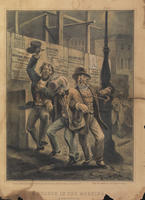 Amusing genre scene depicting three drunk men stumbling arm-in-arm down a city block in front of fenced, wooden scaffolding. The man on the left skips, raises his hat and supports the unconscious man in the middle, who wears a lady's bonnet on his head. The man on the right also supports the bonnet-wearing man while he clings his arm around a lamp post as he holds a long pipe. Playbills and advertisements adorn the wooden fence in front of the scaffolding. The postings promote the National Police Gazette, Wheatley's Arch Street Theatre, Walnut Street Theatre, John Drew's National Theatre, the Academy of Music, and steam boat Edwin Forrest of Trenton Capt. McMakin. An African American coach driver, with a whip in hand, watches the frivolity in the background.