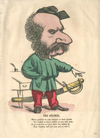 The colonel wears a green jacket and red pants, and his uniform is neither Union nor Confederate. He wears a disproportionally long sword in a scabbard and stands in front of a writing desk. He has long sideburns and a thick moustache.