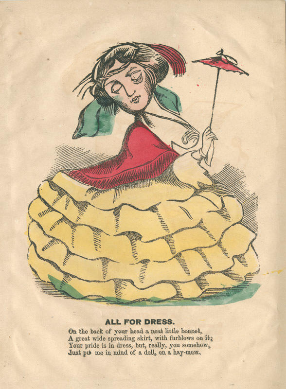 Text: On the back your head a neat little bonnet, / A great wide speading skirt, with furblows on it; / Your pride is in dress, but, really, you somehow, / Just put me in mind of a doll, on a hay-mow.