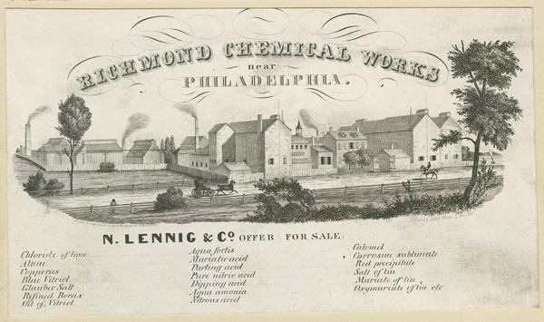 Advertisement card showing a view of the large chemical works for N. Lennig & Co., also known as Tacony Chemical Works, established in 1831 at Richmond and Ann streets in Port Richmond. Several of the buildings contain smokestacks, and most are absent or only contain a few windows. In the foreground, a man leans on a fence lining the road, while behind him, a horse-drawn carriage and man on horseback travel in front of the complex. Also contains a list of 20 chemicals produced by the factory, including Chloride of lime, Aqua fortis, and Muriate of tin, printed below the image. The works ceased operations circa 1848 following the relocation of the plant to Bridesburg beginning in 1847.