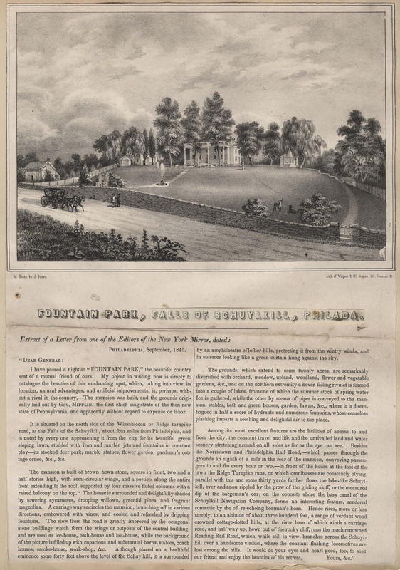 Accompanied by clipping “Extract of a Letter from one of the editors of New York Mirror, dated: Philadelphia, September 1845." Describes in detail the architecture, grounds, and surrounding area of the estate, including the "stocked deer park, marble statues, flower garden, gardner’s cottage ornee, &c &c"; "the couple of lakes from one of which the summer stock of spring water ice is gathered, while the other by means of pipes is conveyed to the mansion, stables, bath and green houses"; and the "facilities of access to and from the city" as a result of the Norristown and Philadelphia Rail Road, Ridge Turnpike, and Schuylkill.