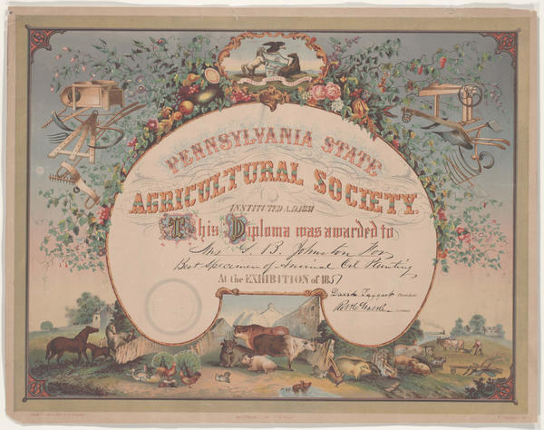 Certificate containing vignettes and graphic elements related to agriculture. Vignettes at the bottom of the print show clusters of farm animals, including cows, pigs, and fowl; a man providing a bowl of feed to a couple of horses with a foul in a fenced pasture in front of a house; and a farmer plowing his field. Graphic elements in the upper corners include farm implements, tools, and equipment, including shovels, pitchforks, sickles, rakes, and a grinding implement. Also includes a vignette depicting the state seal. Flowers, produce, and vinery border the graphics and surround the text of the certificate. The Pennsylvania State Agricultural Society was founded in 1851 by representatives from 50 counties with the object to "foster and improve agriculture, horticulture, and the domestic and household arts." The first annual exhibition of the society was held the same year.