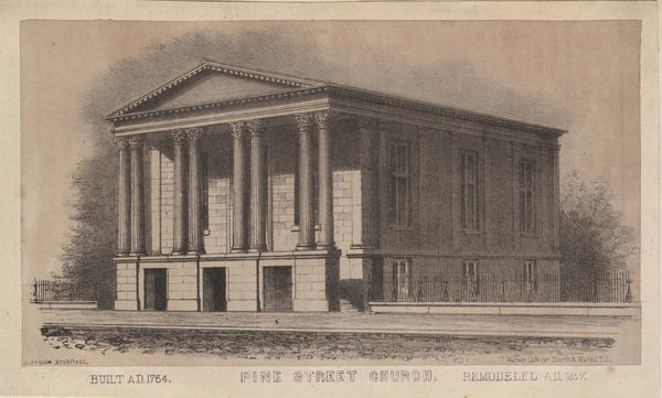 Exterior view showing the remodeled Third Presbyterian Church also known as Old Pine Street Church, originally built 1766-1768 after the designs of Robert Smith, at 400-416 South 4th Street. Columns on pediments adorn the front of the building and an iron-wrought fence protects the church property. Church remodeled from a meeting house to a Greek-style temple in 1857 after the designs of John Fraser.