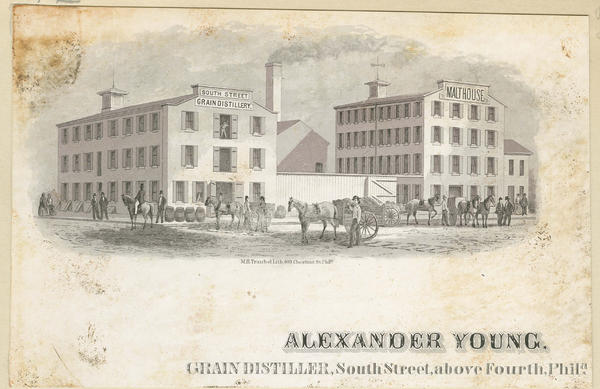 Tradecard showing the “South Street Grain Distillery,” formerly the Southwark Theatre (closed in 1817) and adjacent “Malt House” on the 400 block of South Street. A fenced courtyard separates the processing plants in front of which horse-drawn carts are lined. The vehicles, attended by drivers, arrive for and receive deliveries. Barrels line the sidewalk in front of the distillery and a laborer is visible at the third-floor receiving entrance of the building. Also shows pedestrian and street traffic, including men conversing, ladies strolling, and a man on horseback.The distillery building was removed circa 1908. Young & Co., founded by Alexander Young and John Maitland in 1823, was known for the Y.P.M. brand of rye whiskey.