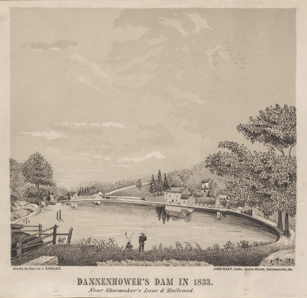 Dannenhower's [sic] Dam in 1833. Near Shoemaker's Lane & Railroad. [graphic] / Drawn on zinc by J. Richards.