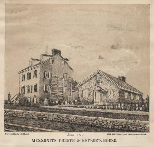 Hart originally issued a series of prints of Germantown between 1863 and 1888 several of which were published as John Richards' Quaint old Germantown in Pennsylvania. A series of sixty former landmarks of Germantown and vicinity... Collated, arranged and annotated by Julius Friedrich Sachse (Philadelphia, 1913), Pl. XVI. Caption in publication reads: The Mennonite church and Samuel Keyser's, built A.D. 1770 (No. 6121-31), and the Samuel Keyser House with its old pump site (Site of no. 6133-35). Demolished about 1871.