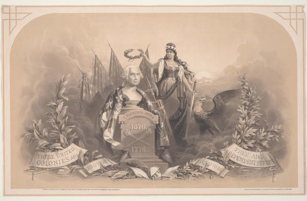 Allegorical print showing the figure of liberty holding a laurel wreath over a bust of George Washington that is mounted on a pedestal reading “E. Pluribus Unum 1876 1776”. The image of two overlapping torches separates the dates on the pedestal and an American flag drapes the bust. The figures are surrounded by an eagle, American flags and oak leaves intertwined with a banner that reads “These United Colonies Are And Of Right Ought To Be Free And Independent States,” a quote from the Declaration of Independence.