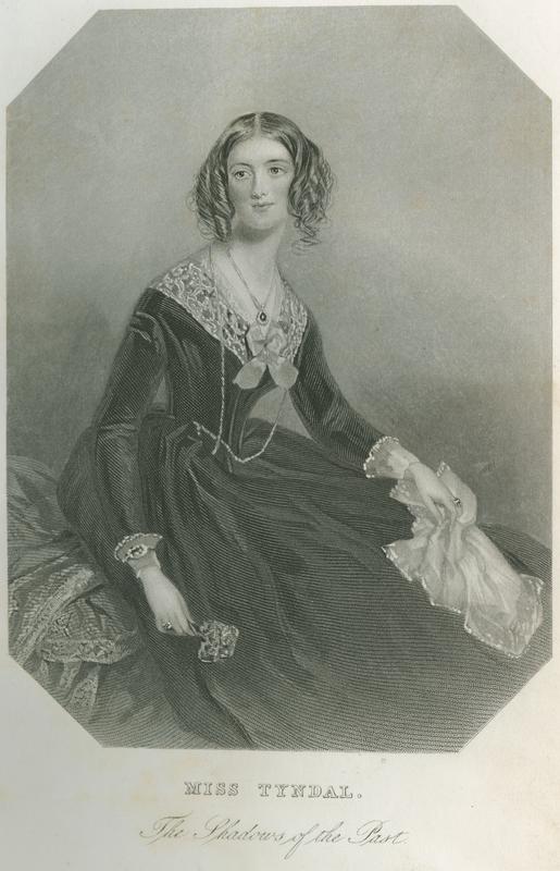 Three-quarter portrait of Miss Tyndal, seated with a flower in her right hand and a handkerchief in her left hand.