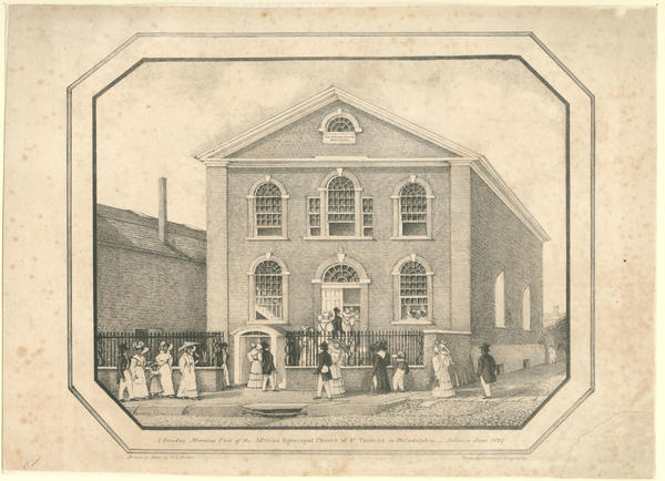 Busy street scene showing elegantly-dressed African American parishioners of all ages entering the first African Episcopal church in the United States at the corner of Fifth and Adelphi (i.e. Saint James) streets. Includes a date stone in the eave of the church that reads "The African Church MDCCXCIII." Also shows a man leading a horse near the rear of the building. The church was established in 1794 by the religious and beneficent organization, the Free African Society, as a result of the discriminatory practices of the city’s congregations. Absalom Jones, a freed slave, became rector of the church in 1796 and remained as its minister until his death in 1818.