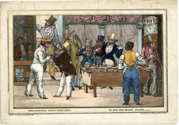 Satiric scene showing high society, i.e., "bon-ton" in a Philadelphia oyster cellar. A "gentleman" descends the stairwell to the swankly decorated cellar where a motley gathering of men drink, smoke, gossip, and suck oysters. An African American bartender serves drinks from decanters in the left of the image. The bar is adorned with a notice reading "City Privilege still without license." Another African American attends the oyster bar. Plates, crackers, salt, and vinegars line the edge. In the right of the image, a sick-faced patron wobbles and spills his drink next to a tall clock with a decorated face and the inscription "Music has charms." Possibly, the cellar at 806 Market Street operated by African American proprietor James Prosser from about 1830.