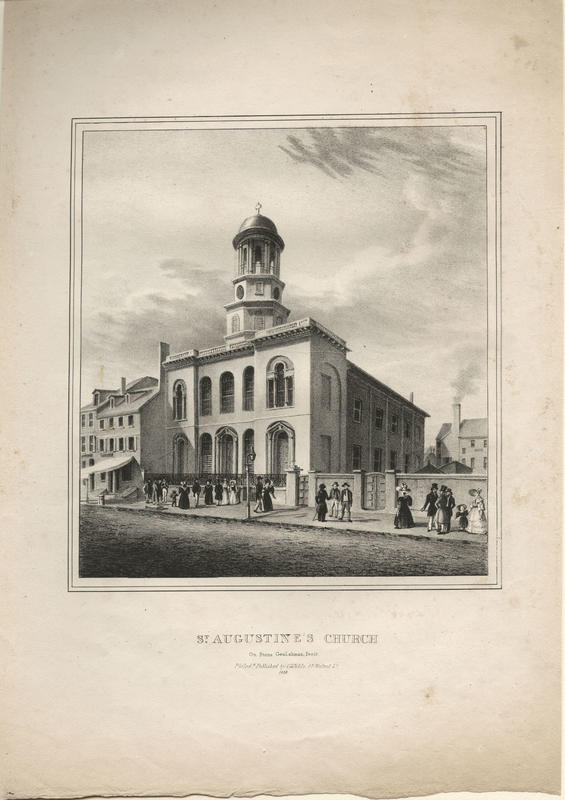 Exterior view showing the Romanesque-style Catholic church built in 1801 after the designs of Douglas Fitzmaurice Fagan at 260-262 North Fourth Street. Includes the tower built in 1829 after the designs of William Strickland. Several parishioners, including men, women, and children, congregate in small clusters on the sidewalk in front of the church. Also shows the adjacent church courtyard protected by a stone wall and surrounding buildings, including one with an awning. The congregation formed in 1796 under Father Matthew J. Carr to serve the large German and Irish immigrant community residing in the northern sections of the city. The church was razed during the Nativist Riots of May 1844.