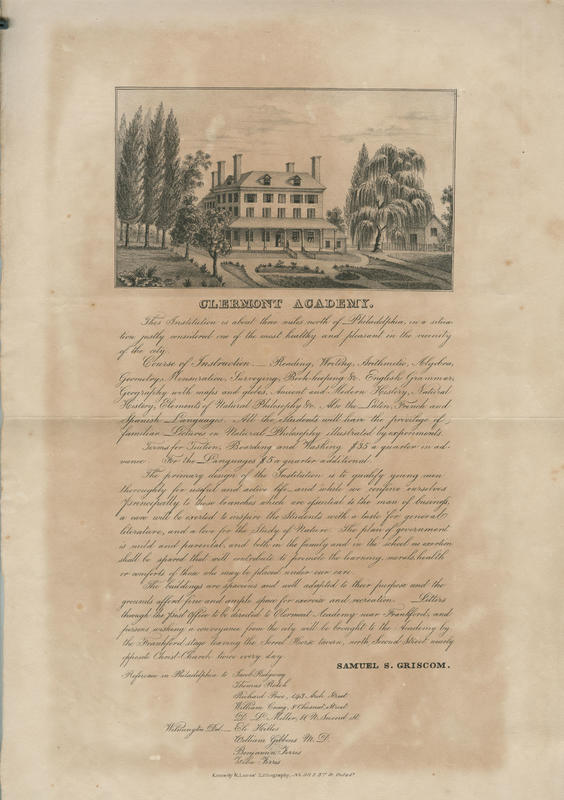 Handbill containing a view of the boy's boarding school built in 1804 for brothers John Thomas and Charles Carre at Heart Lane and Nicetown Lane, between Germantown and Frankford. School property includes landscaped lawns, a barn, and trees. A man approaches the entrance of the school where a woman waits at the door. Pupils are visible in the first floor windows. Also contains several paragraphs signed by administrator Samuel S. Griscom describing the school, including location, "Course of Instruction," "Terms for Tuition," and the school philosophy in addition to names of references. The school was acquired by Griscom in 1828.