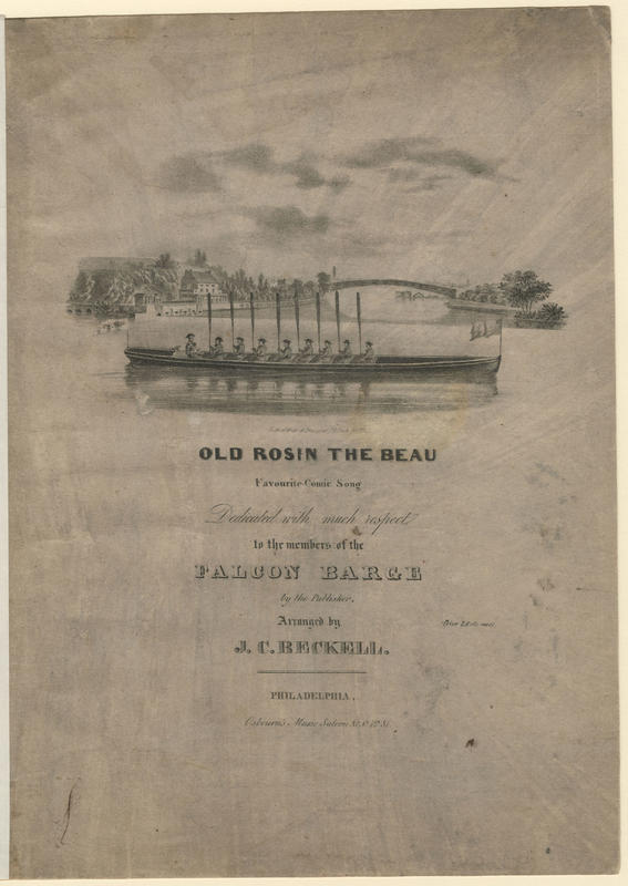 Sheet music cover showing the Falcon crew on their barge near the Fairmount Water Works. The nine-men crew includes a coxswain and eight oarsmen wearing striped uniforms, the latter holding up their oars. The barge is adorned with an American flag on the bow and the club flag on the stern. Also shows the covered bridge, known as the Upper Ferry Bridge (destroyed by fire in 1838) in the background. The waterworks were originally built between 1812 and 1822 after the designs of Frederick Graff. Old Rosin the Beau is an Irish drinking song.
