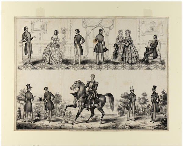 Fashion advertisement containing two panelled scenes of 11 elegantly attired men, women, and children in a parlor and outdoor setting. Upper panel shows the parlor scene. Four men and three women socialize. Three of the men wear suits and one, dressed in evening attire, sits in a chair. Two of the men hold top hats and all have chin beards. One woman wears an evening dress and the other two women are attired in day dresses and bonnets. One of the latter pair wears a shawl and the other holds a handkerchief. Also includes framed pictures, mosaic carpeting, a window with drapery, and a pedestal displaying a vase of flowers. Lower panel shows the outdoor scene. In the center, "Genl. David R. Porter, Govr. Of Penna. Copied by permission of Huddy & Duval" wears his uniform and is mounted on his horse. To the left, two men in overcoats stand near a hitching post. To the right, two men attired in top hats (one white), vests, jackets, pants, and holding canes, stand. In the background, a militia troop drills, including two separated members on horseback. All the men are clean shaven. Key numbered 1-7 and 8-11 printed above and below the image.
