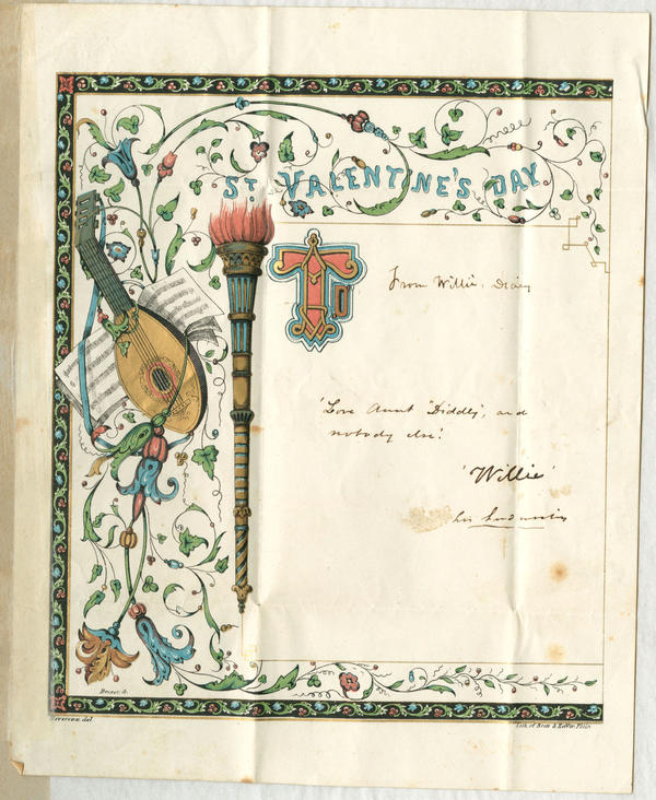 Valentine containing a decorative border with a renaissance motif. Border comprised of flourishes, floral designs, a mandolin resting on a musical score, and a torch.