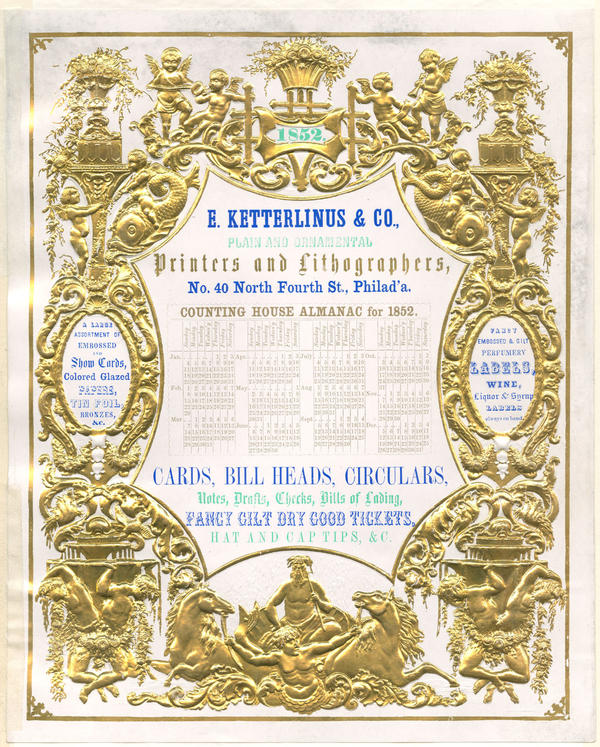 Advertisement calendar, containing an embossed and gilted border of classical imagery, for the studio established by Eugene Ketterlinus in 1842. Imagery includes scrolls; urns of flowers; cherubs playing instruments, riding fish, and holding up pedestals; and the sea god Poseidon in his chariot pulled by horses and a merman. Also contains advertising text promoting the products of the firm. Includes show cards, color glazed papers, tin foil, bronzes, bills of lading, fancy gilt dry good tickets, and hat and cap tips in addition to fancy embossed and gilt labels "always on hand." Ketterlinus was one of the earliest Philadelphia lithographers to produce stock cards, and embossed and colored mercantile labels. The firm remained in business until the 1970s.
