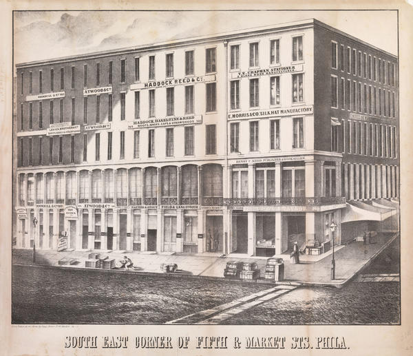 Advertisement showing storefronts with pre-consolidation addresses on the 400 block of Market Street. Businesses include Rockhill & Co., clothiers, Levick, Jenkins & Co., shoes, bonnets, hats, & caps/ Levick, Brothers & Co., boots, shoes, & straw goods, and Rhoads Brother & Co., importer of Paris fancy goods (160); Atwood & Co., dry goods (162); Chaffees & Stout, dry goods (164); Haddock Reed & Co./Haddock, Haseltine & Reed, boots, shoes, caps & straw goods (164-166) ; Field & Langstroth, hardware (166); and T. E. Chapman, stationer & blank book manufacturer, E. Morris & Co., silk hat manufactory, Henry C. Baird, publisher & bookseller, G. W. & L. B. Taylor, boots & shoes (168). Signage adorns the storefronts. Trunks and barrels line the sidewalk on which a laborer creates a pile of crates. Two gentlemen stand in the doorway of Haddock Reed & Co. and a woman holding a parasol strolls past the Taylor storefront. Also shows E. Morris, hat manufactory on North Fifth Street. Two men converse under an awning adorning the building.