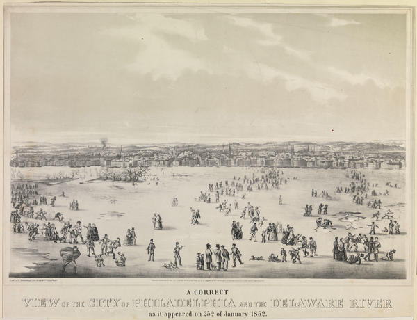 Panoramic and bustling, winter view showing several men, women, and children, on the ice-covered river. In the center foreground, a small crowd gathers around a man reading a newspaper as around them, throngs of individuals traverse the frozen walkway, promenade as couples, make conversation, and fall, laugh, and grab one another as they slip on the ice. Several men skate, boys sled, dogs chase each other, and children frolic, including a pair retrieving a hat from a broken patch of ice. Others peddle refreshments from a table and flee from broken ice as ruffians engage in a fist fight. The cityscape of Philadelphia is visible in the background, including Christ Church and Independence Hall in addition to Spark's Shot Tower and Girard College. Also shows the frozen channel running through Windmill Island covered in barren trees in the far left of the image.