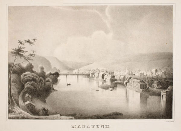 Landscape view showing the village of Manayunk along the east bank of the Schuylkill River, northwest of Philadelphia. Townscape is visible in the right of the image, including Joseph Ripka's cotton mills erected 1831, 1835, and 1853 near the depicted Flat Rock Turnpike Bridge. A rowboat sails the river and a railroad track lines the west bank. Manayunk was incorporated into the city of Philadelphia in 1854.