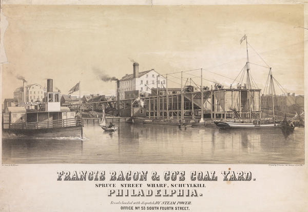 Francis Bacon & Co.'s coal yard. Spruce Street Wharf, Schuylkill Philadelphia. [graphic] : Vessels loaded with dispatch, by steam power. Office no. 53 South Fourth Street. / On stone by W. H. Rease.