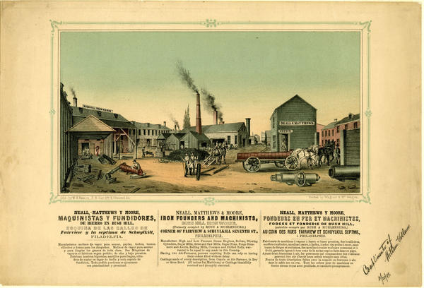 Neall, Matthews Y Moore, maquinistas y fundidores, de hierro en Bush Hill, esquina de las galles de Fairview y la septima de Schuylkill, Filadelfia = Neall, Matthews & Moore, iron founders and machinists, Bush Hill Iron Works, (formerly occupied by Rush & Muhlenberg,) corner of Fairview & Schuylkill Seventh St., Philadelphia = Neall, Matthews Y More, fondeurs en fer et machinistes, forges et fonderie de Bush Hill, (autrefois occupée par Rush & Muhlenberg,) au coin des rues Fairview et Schuylkill Septme., à Philadelphie. [graphic] / Lith. by W. H. Rease, n.e. cor 4th & Chestnut St.
