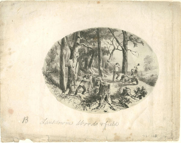 Shows four men chopping trees and logs on the estate west of the Schuylkill River (West Fairmount Park) purchased by legislator William Bingham in 1797. Tree stumps are visible in the foreground. The estate, originally owned by Pennsylvania governor John Penn, was bought and ceded to the city in 1866 for inclusion in Fairmount Park.