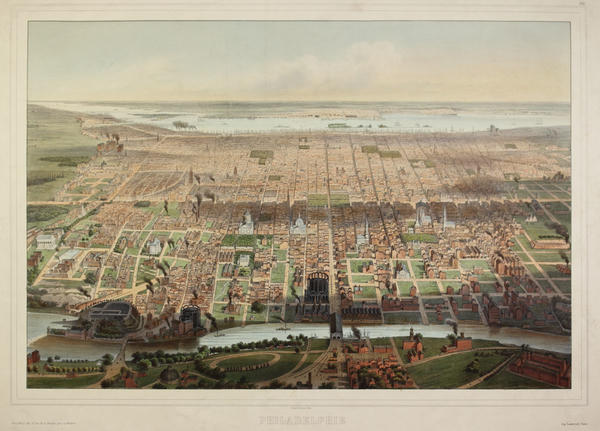 Bird's eye view after the John Bachmann print published by J. Weik in 1857. Predominately shows the built city from the Schuylkill
