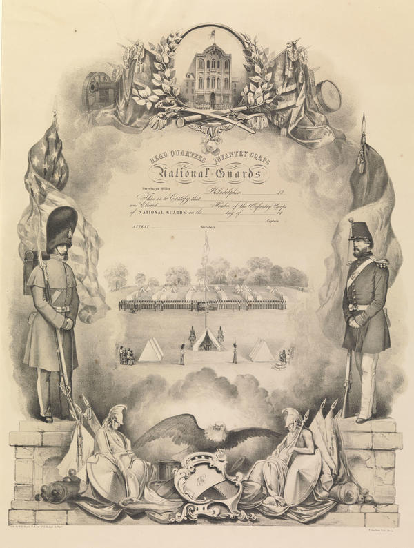 Membership certificate containing views and vignettes related to the Pennsylvania Militia. Central view shows troops on display in front of their tents at a militia campground. Men and women spectators watch the troops from near the tent of the commander in the foreground. The commander's tent, flanked by guards on foot and horseback, and four other tents, faces away from the troops who stand in formation. Also includes vignettes above, to the sides, and below the certificate text. Top vignette shows an exterior of the National Guards Hall built 1856-1857 at 518-520 Race Street. Troops form lines in front of the building. Vignette is in an oval frame that is partially covered in laurel, and bordered by cannons, swords, a drum, a spy glass, bayonets draped in cloth and adorned with wreaths, and medals. Side vignettes depict National Guard soldiers on stone pedestals. The militia man on the left wears a winter uniform and backpack, holds a rifle, and stands in front of the American flag. The soldier on the right wears a standard uniform, holds a rifle, and stands in front of the flag of the National Guard. Bottom vignette shows an American eagle on a "N.G." shield between female and male classical figures of war, heads down, leaning on shields and flags bordered by cannons and cannon balls. The Pennsylvania Militia, originally organized in 1747, was legally renamed the National Guard of Pennsylvania in 1870.