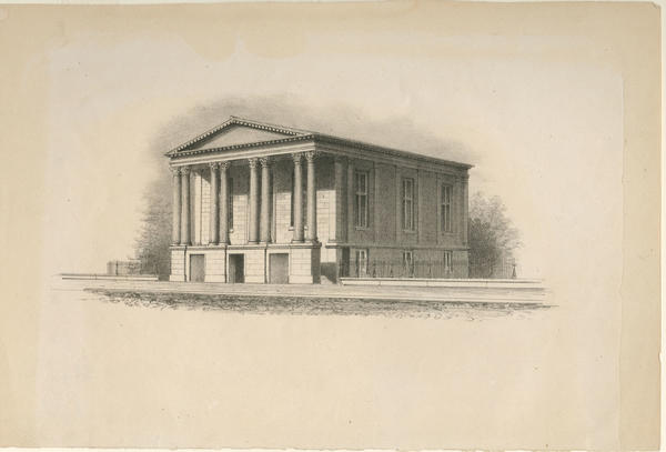 Proof of an exterior view showing the remodeled Third Presbyterian Church also known as Old Pine Street Church, originally built 1766-1768 after the designs of Robert Smith, at 400-416 South 4th Street. Columns on pediments adorn the front of the building and an iron-wrought fence protects the church property. Church remodeled from a meeting house to a Greek-style temple in 1857 after the designs of John Fraser.