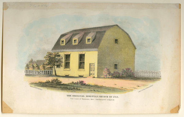 View of the first Moravian church building in Philadephia built 1742-1743 for the followers of Count Zinzendorf, a Bishop of the Moravian Church. Shows the hip-roof building with a front yard containing a path and a white picket fence in the background. Also shows a partial view of a nearby building. The church building, which was expanded and a parsonnage added, housed the congregation until 1819 and the erection of a new sanctuary.