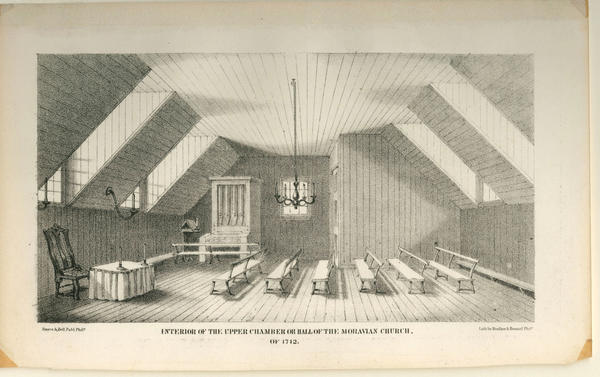 Interior of the upper chamber or hall of the Moravian Church, of 1742. [graphic] / Lith. by Herline & Hensel, Phila.