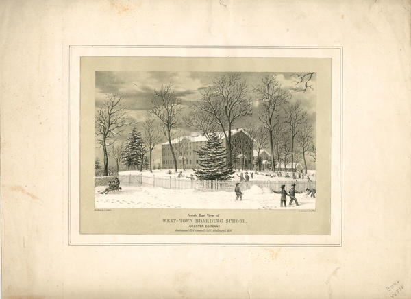 Genre winter scene showing male students frolicking in the snow at the east end of the main building of the co-educational Quaker boarding school. Boys build snowmen, have snow ball fights, and sled on the snow-laden grounds covered with footsteps. Westtown was established in 1794 by the Society of Friends as a boarding school for boys and girls. The campus was separated into the girls' and boys' bounds, i.e., yards for recreation. Sledding, or coasting, was a favorite winter activity.