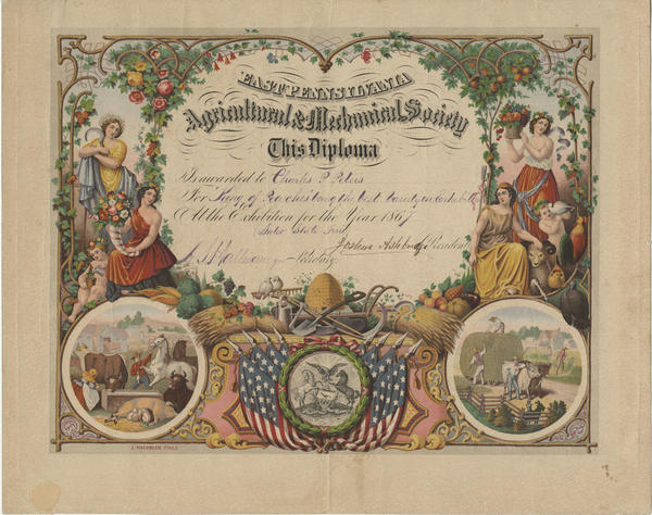 Fair certificate containing an ornate border with vignettes, female allegorical figures, and pictorial elements related to agriculture and horticulture. Vignettes show the Pennsylvania coat of arms (surrounded by flags) and montages of scenes of life on a farm. Farm scenes include a farmhouse; barns; a woman milking a cow; a farmhand settling a horse; piglets suckling on their mother; sheep being corralled; a field being cleared; and farmhands loading a wagon full of hay. Allegorical figures hold a sickle, cornucopia of flowers, a basket of fruit, and the head of a ram that lays near other farm animals. Border also includes cherubs, garlands of vines and flowers, fruit bushes, and displays of farm produce. Two bales of wheat clustered with doves, a bee hive, and gardening tools form another pictorial element. The East Pennsylvania Agricultural & Mechanical Society was established in 1860 in Norristown following a split from the Montgomery County Agricultural Society. The society held its first fair in 1861.