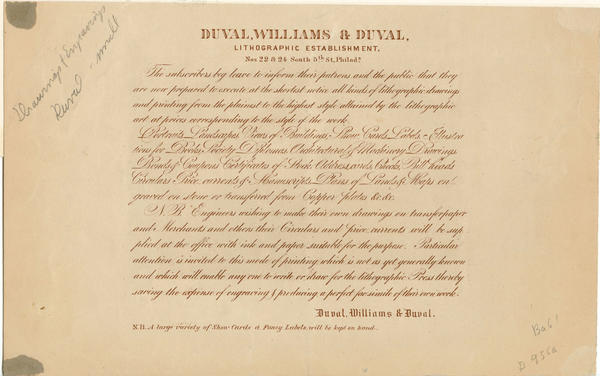 Duval, Williams & Duval late P. S. Duval & Son lithographers, 22 & 24 South 5th St., ab. Chestnut Philada. [graphic] : All works appertaining to the various branches of lithographic drawing, engraving, and transferring, printing, plain and in colors, are executed in this establishment in the best style of the art. Turn over / Queen.