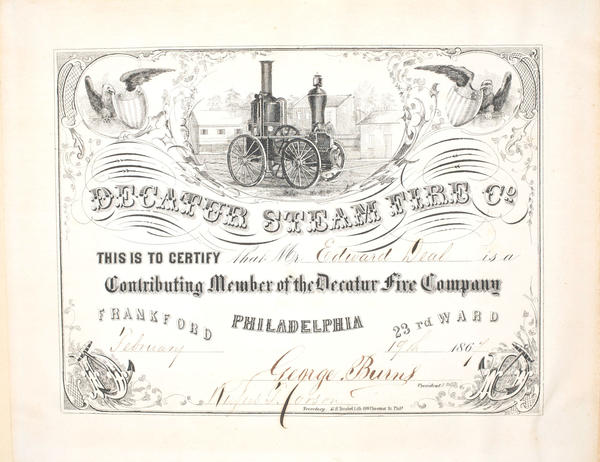 Membership certificate containing a vignette of a steam engine in a rural setting, presumably Frankford. Also contains filigree and cornice details, including American eagles holding shields, and the letter "D" ornamented with anchor details. The fire company stationed in Frankford was instituted in 1803 and incorporated in 1842. The company was named after the Naval hero Stephen Decatur whose father purportedly resided in Frankford.