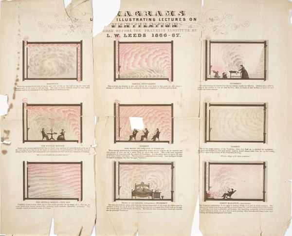 Variants of six of the diagrams published as two lithographs in Lewis W. Leeds Lectures on ventilation: being a course delivered in the Franklin Institute,.... (NY: John Wiley & Sons, 1868). [LCP Am 1868 Leeds, 17720.O].